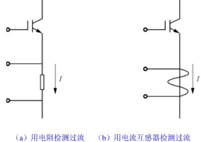 如圖5(a)及圖5(b)所示,可以用電阻或電流互感器與IGBT串聯,檢測流過IGBT集電極的電流。當有過流情況發生時,控制執行機構斷開IGBT的輸入,達到保護IGBT的目的。