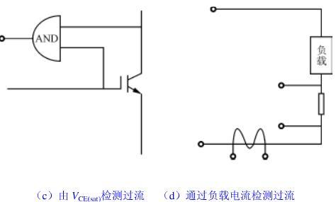 此方法與圖5(a)中的檢測方法基本相同,但圖5(a)屬直接法,此屬間接法,如圖5(d)所示。若負載短路或負載電流加大時,也可能使前級的IGBT的集電極電流增大,導致IGBT損壞。由負載處(或IGBT的后一級電路)檢測到異常后,控制執行機構切斷IGBT的輸入,達到保護的目的。