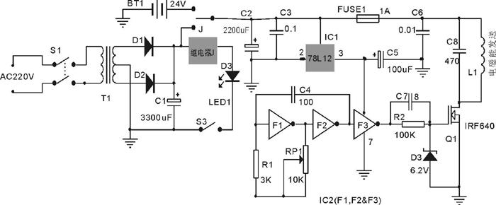 經繼電器J選擇的+24V直流電主要為發射線圈L1供電,此外,經IC1(78L12)降壓后為集成電路IC2供電,為保證J的動作不影響發送電路的穩定工作,電容C3的容量不得小于2200uF。