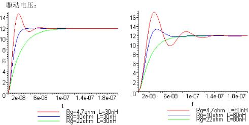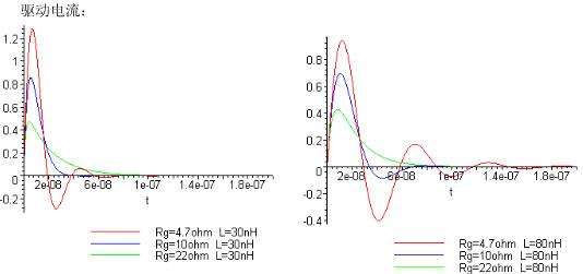 關(guān)于Rg、L對(duì)于上升時(shí)間的影響:(Cgs=1nF,VCgs=0.9*Vdrive)