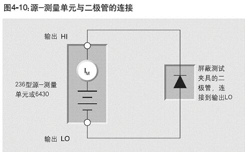 圖4-10 示出如何使用236型或6430型SMU來測量二極管的泄漏電流。236型SMU能夠以10fA的分辨率測量電流,并且輸出需要的偏置電壓。6430型SMU的分辨率為10aA。源-測量單元還可以測量其它的二極管參數,包括正向電壓降和擊穿電壓。