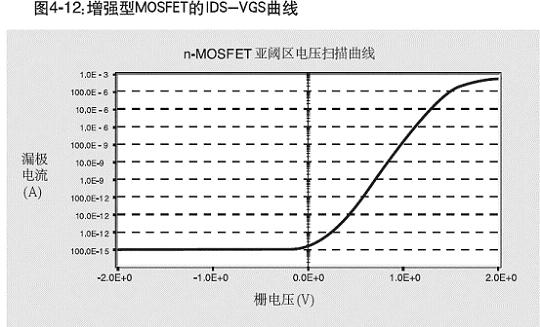 圖4-12 是一個增強型MOSFET的IDS對VGS曲線。該曲線是在4200- SCS型半導體特性測試系統上得到的。