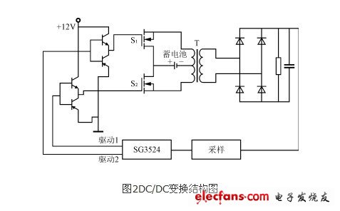 由于變壓器原邊電壓比較低,為了提高變壓器的利用率,降低成本,DC/DC變換如圖2所示,采用推挽式電路,原邊中心抽頭接蓄電池,兩端用開關管控制,交替工作,可以提高轉換效率。而推挽式電路用的開關器件少,雙端工作的變壓器的體積比較小,可提高占空比,增大輸出功率。