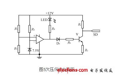 圖5中運算放大器的正向輸入端的電壓由R1和R3分壓得到,而反向輸入端的電壓由穩壓管箝位在+7.5V,當蓄電池的電壓下降超過預定值后,運算放大器開始工作,輸出跳轉為負,LED燈亮,同時三級管V截止,向SG3524的SD端輸出高電平,封鎖IR2110的輸出驅動信號。