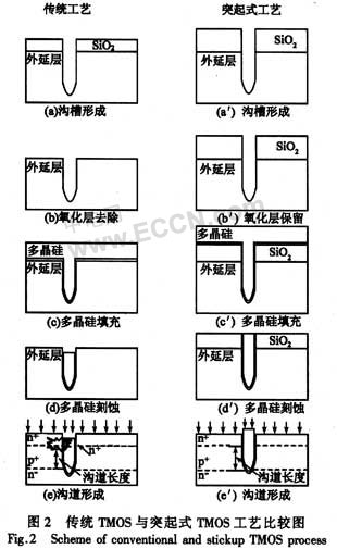當相鄰單位元胞尺寸不斷縮小后,尤其在設計柵極氧化膜較薄的器件時,在傳統的TMOS工藝中,源區注入會穿透柵極側壁影響器件性能。采用突起式結構可以有效地避免刻蝕工藝及源區注入對較短溝道器件的間接影響,消除了器件穿通的風險,保證了器件的穩定性能和可重復性。
