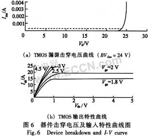 為了驗證這一理論,特別設計了在傳統工藝下,柵極頂部到外延層表面的多晶硅去除量(130 nm/230 nm/310 nm)的試驗。通過器件的電性能參數比較,如圖4(a)所示,可以看到,隨著多晶硅去除量的增加,閾值開啟電壓隨之降低,說明了器件溝道有效長度變短,源區離子通過側壁注入到溝道中,源區結深在溝道表面變深。同時由圖4(b)可知,漏源間漏電流也有明顯的區別,當多晶硅去除量在310 nm時,從累積概率圖中可以看到有部分區域漏電流增大,這一現象隨著多晶硅去除量的減少而逐步消失,從而驗證了溝道有效長度與多晶硅去除量有很強的相關性。由此可見,為了減少器件性能與刻蝕工藝的相關性,采用突起式多晶硅技術是非常必要的。圖5是采用透射電子顯微鏡所得到的突起式TMOS實際截面圖。可以看到在該圖中的突起式多晶硅結構以及溝槽式接觸,單位元胞相鄰間距為1.4μm的n型TMOS,單個芯片有源區面積為0.4 nm2,并采用TSOP6封裝。圖6(a)、(b)分別是器件擊穿電壓曲線以及輸出特性曲線。由圖6(a)可以看到,當漏端漏電流為250μA時,擊穿電壓為24 V,滿足大于20 V的設計需要,由圖6(b)可以看到,當柵極開啟電壓為4.5 v、工作電流為5 A時,對應的導通電阻大致為23.75 mΩ。由于芯片有源區設計尺寸為0.4 mm2,最終Rdson·A為9.5 mΩ·mm2