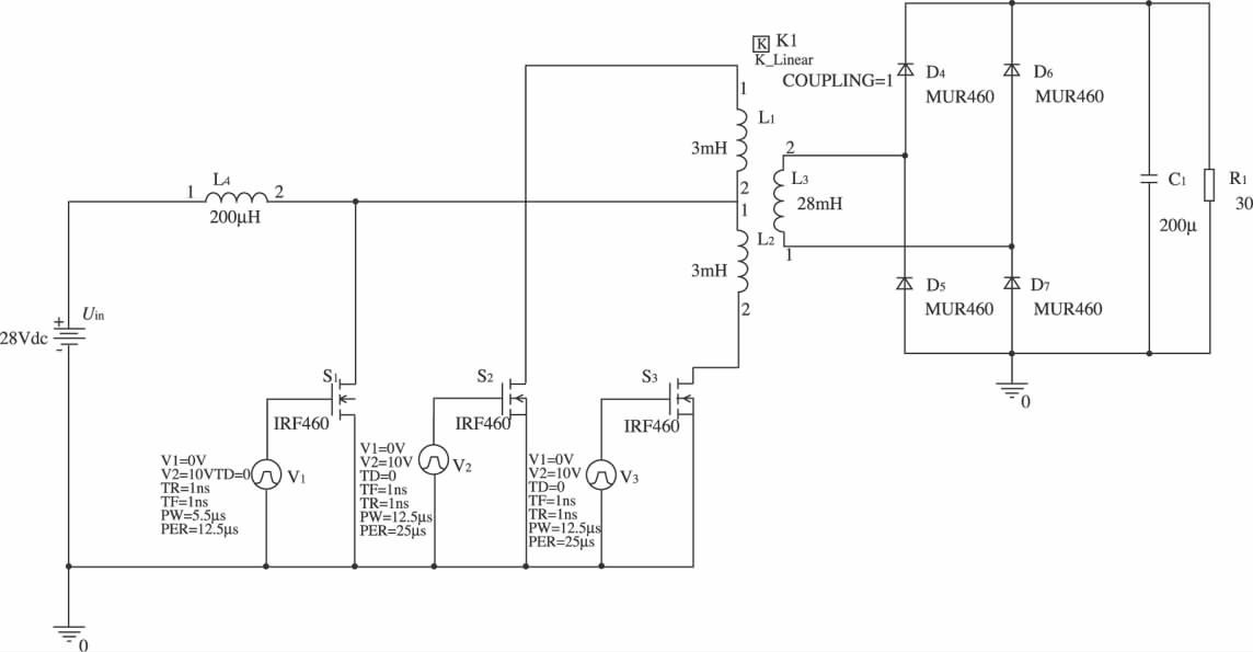 輸入直流電壓:Uin = 28 VDC; 輸出直流電壓:Uo= 270 VDC; 變壓器原、副邊匝比:n = 5; 升壓電感:L4= 200 μH; 輸出濾波電容:C1 = 200 μF; 開關管:IRF460; 功率二極管:MUR460。