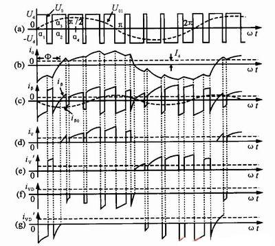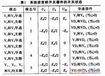 通過比較可知,因為續(xù)流的緣故,死區(qū)時間內A、B點的電位不再為零。當i>0時,VD2、VD3續(xù)流形成回路,A端電位UA為-Ed/2,B端電位UB為+Ed/2;當i<0時,VD1、VD4續(xù)流形成回路,A端電位UA為+Ed/2,B端電位UB為-Ed/2。