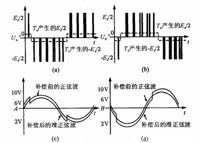 在死區(qū)時間內,由于續(xù)流的緣故輸出電壓波形發(fā)生了畸變,通過對波形進行等效的補償可以得到準正弦波。推理和實驗均證明該方法能較好地對逆變器橋路輸出電壓進行補償。該方法簡單實用,易于實現(xiàn),具有一定的工程使用價值。