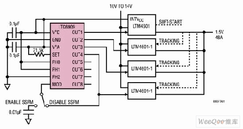 硅振蕩器為多相、擴(kuò)頻開關(guān)穩(wěn)壓器時(shí)鐘提供了一個(gè)理想的平臺。除了具有一個(gè)板上時(shí)鐘發(fā)生器之外,這些固態(tài)器件還能將擴(kuò)頻調(diào)制與多相輸出組合起來。考慮到這一點(diǎn),凌力爾特公司開發(fā)出了LTC6909(圖1),這是一款具有8個(gè)單獨(dú)多相輸出的精準(zhǔn)擴(kuò)頻硅振蕩器。單個(gè)電阻器負(fù)責(zé)在12.5kHz至 6.67MHz的范圍內(nèi)選擇輸出頻率。三個(gè)邏輯輸入用于設(shè)定輸出相位關(guān)系(范圍從45°至120°),從而允許LTC6909為多達(dá)8個(gè)相位提供同步。可以啟用一種偽隨機(jī)擴(kuò)頻調(diào)頻,頻率擴(kuò)展量在中心頻率的±10%。用戶可選擇3種調(diào)制速率之一,以確保調(diào)制速率不超過穩(wěn)壓器的帶寬。此外,LTC6909還具有一個(gè)創(chuàng)新的濾波器,該濾波器負(fù)責(zé)跟蹤SSFM調(diào)制速率并在頻率轉(zhuǎn)換之間提供平滑處理。