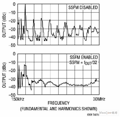 除了多相同步之外,還可以通過連續(xù)改變開關(guān)穩(wěn)壓器時(shí)鐘的頻率來改善EMI。這種被稱為SSFM的技術(shù)不允許發(fā)射能量在任何接收器的頻段中停留過長的時(shí)間,從而改善了EMI。為了最大限度地發(fā)揮SSFM的效用,主要有4個(gè)必需考慮的因素:受影響接收器的帶寬、頻率調(diào)制的方法、頻率擴(kuò)展量和調(diào)制速率。