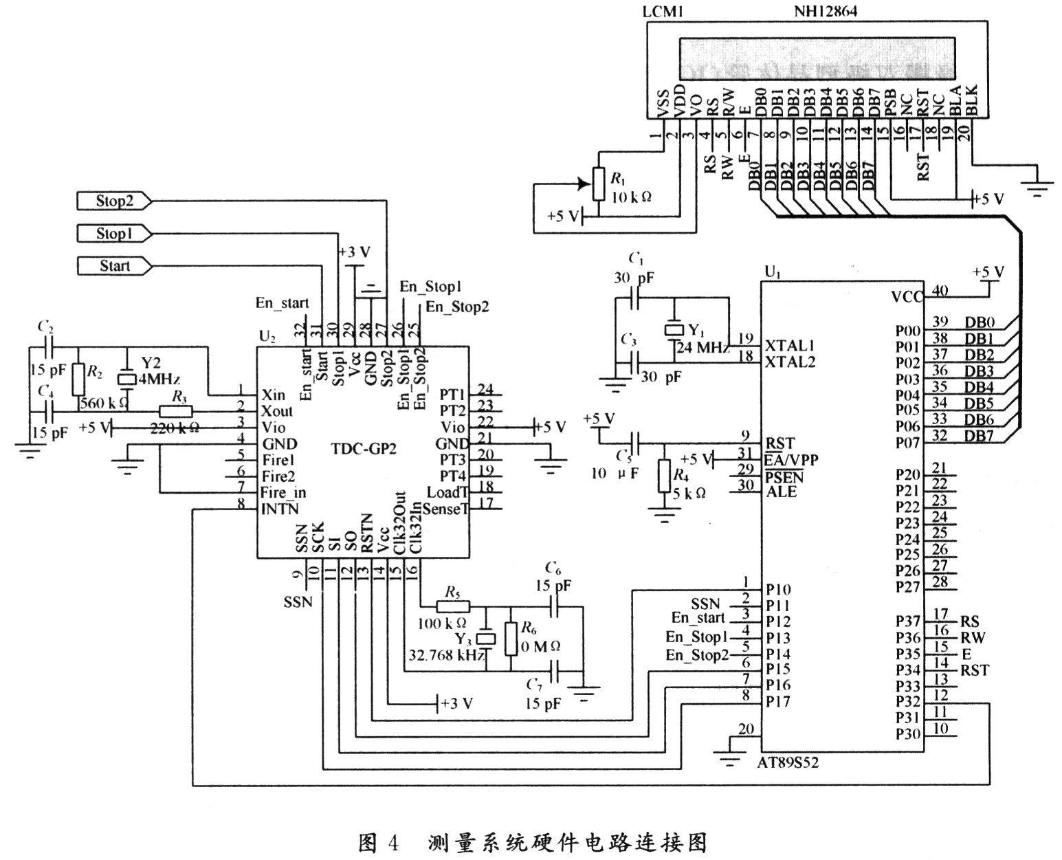 系統(tǒng)主要由脈沖信號(hào)取樣器、脈沖輸入信號(hào)整形電路、TDC-GP2測(cè)量電路、AT89S52單片機(jī)、液晶顯示電路、電源電路、時(shí)鐘電路組成。TDC-GP2的每個(gè)測(cè)量通道都提供一個(gè)使能引腳,可獨(dú)立地設(shè)置這兩個(gè)引腳進(jìn)行通道選擇。TDC-GP2需要一個(gè)2~8 MHz的高速時(shí)鐘進(jìn)行校準(zhǔn)用。TDC-GP2只是在進(jìn)行時(shí)間測(cè)量時(shí)才必須用振蕩器,且能夠自動(dòng)控制振蕩器的開(kāi)啟時(shí)間。整個(gè)系統(tǒng)的硬件電路連接如圖4所示。