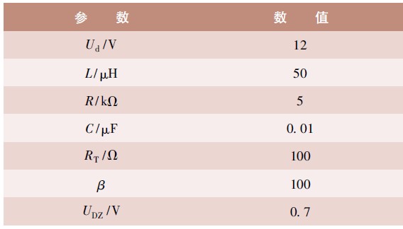 根據(jù)以上參數(shù)設(shè)置可得到電感上峰值電流為IP = 1. 4 A,輸出電壓UO = 10. 5 V。仿真電路圖如圖5 所示。