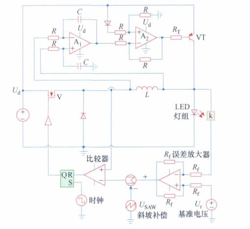 圖4 大功率LED 模型圖控制電路采用傳統(tǒng)峰值電流控制,設(shè)定參考電壓Ur = 10. 5 V; 電壓采樣系數(shù)ku = 0. 8; 電流采樣系數(shù)為ki = 1; 誤差放大器放大倍數(shù)設(shè)為1; 時鐘頻率fs = 200 kHz; 占空比為0. 1。該電路占空比D > 0. 5,需要斜坡補償。根據(jù)斜坡補償原則:所選定斜坡上升斜率m>-m2/2,其中m2為電感電流下降斜率。選定鋸齒波幅值為0. 8 V、頻率為200 kHz。