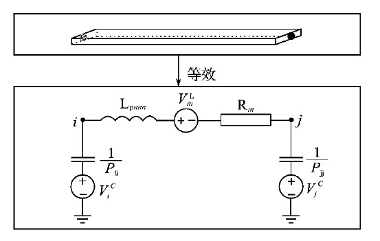 J.Ekman提出了基于寄生參數矩陣的等效電路的建立方法,即把所有互感、互容等效成受控的電壓源,與自感、自容連接(相當于把所有互感、互容對電路的影響等效到受控電壓源上),從而建立等效電路模型。圖4所示為任意兩個節點間的等效電路模型。
