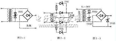 圖2-3所示電路中,單向TVS1和TVS2反接并聯于電源變壓器輸出端或選用一個雙向TVS,用以保護整流電路及負載中的元器件。