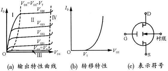 圖2  N溝道增強型絕緣柵場效應管的特性曲線和表示符號[page]