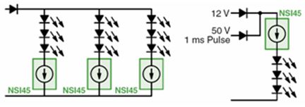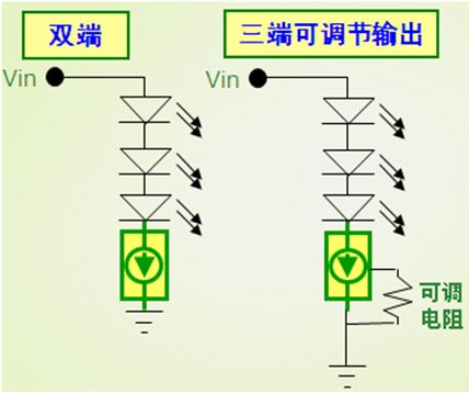 適合低電流LED應用的CCR,可以采用安森美半導體運用專利自偏置晶體管(SBT)技術開發出來得NSI45系列。這系列CCR包含雙端固定輸出和三端可調節輸出兩種類型,電流等級涵蓋10至180 mA,雙端及三端CCR電路圖如圖2所示。其中三端可調節輸出CCR包括電流30至80 mA(SOT-223)及60至150 mA(DPAK)等不同選擇,能夠用于滿足特定電流設置要求。