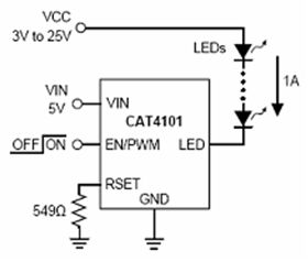 而在要求驅動大電流的高亮度LED汽車照明應用中,可以采用安森美半導體的CAT4101高亮度線性LED驅動器。CAT4101能驅動一串電流高達1 A的高亮度LED,且滿載時的壓降僅為極低的0.5 V。這種簡單方案不要求電感,消除開關噪聲,將元件數量減至最少,并簡化設計,典型應用電路如圖5所示。