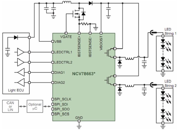 一般而言,汽車前照燈要求支持從單個LED到多串LED,電壓可高達60 V;此外,還要求支持脈寬調制(PWM)調光(如用于示廓燈)、高集成度、高能效、LED串低電磁輻射、集成診斷及通信接口等。安森美半導體針對LED汽車前照燈系統開發了NCV78663電源鎮流器及雙LED驅動器。NCV78663是先進的高可靠性、高能效的系統級芯片(SoC) LED驅動器,支持達2 A電流,提供高于90%的總能效,驅動高達60 V電壓的多串LED,能以PWM調光維持色溫及控制平均電流,使設計人員能夠以一顆高集成度的SoC控制遠光燈及近光燈、日間行車燈、轉向指示燈及霧燈,所需外部元件極少。這器件通過SPI接口與外部微控制器通信,在上電后動態地控制系統參數、檢測LED工作狀態并反饋診斷信息。圖8顯示的是NCV78663在先進的汽車前照燈應用中的電路圖。