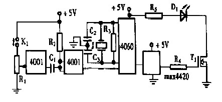 為了穩定被調制光信號的頻率,電路中使用了分頻器CD4060 。它帶有一個外接晶體振蕩器,內部有多級分頻器。對于1M 晶振來說,經過4 060 的六次分頻,可以得到頻率穩定的151625kHz 的方波,再通過功率場效應管的電流放大,就可以同時驅動上百個發光二極管同時發光。