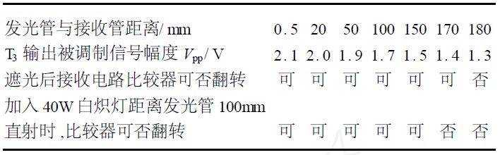 表1 為實驗測得的數據。發光管和接收管之間正面相對, 兩者之間無聚焦光學元件。用有無遮光對整機主要參數進行測試。由表可知,兩管表面之間的相對距離在015~170mm范圍內,無需調整靈敏度都能正常工作。