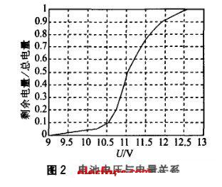 系統工作時間與電池電量成線性關系, 而電量與電池端電壓為非線性關系。圖2 所示為本系統所用電池在2 000 mA 恒流放電的情況下, 電池端電壓與電量的關系曲線, 其中橫軸為電池電壓, 縱軸為剩余電量相對于總電量的百分比。根據此曲線, 在MCU 軟件中擬合一個電壓與電量關系的數據表, 同時設置10 V為告警電壓; 系統可以實時查詢諸如電池電壓、電流、剩余電量、估計供電時間等信息, 并同時仿手機做成3段式顯示, 使上位機全面掌握電池狀態,決定控制策略, 從而提高系統運行可靠性。MCU 軟件使用KeiluV2 軟件開發, 上位機軟件使用LabWindow s 軟件開發。MCU 除完成電量查詢相關功能, 還要完成報警與顯示功能; 上位機軟件同時要完成環境參數的相關采集與處理。