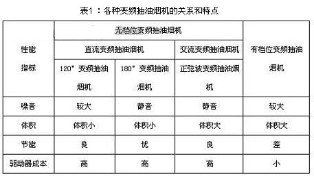 抽油煙機(jī)變頻的目的是為了通過調(diào)整抽油煙機(jī)上的帶動(dòng)風(fēng)扇的電機(jī)轉(zhuǎn)速,進(jìn)而根據(jù)油煙量的大小調(diào)整油煙抽吸的快慢。優(yōu)良的調(diào)速和節(jié)能效果使得變頻抽油煙機(jī)在性能上明顯優(yōu)越于傳統(tǒng)的抽油煙機(jī),而變頻抽油煙機(jī)根據(jù)具體的變頻技術(shù)有不同的分類和性能特點(diǎn),如表1所示。