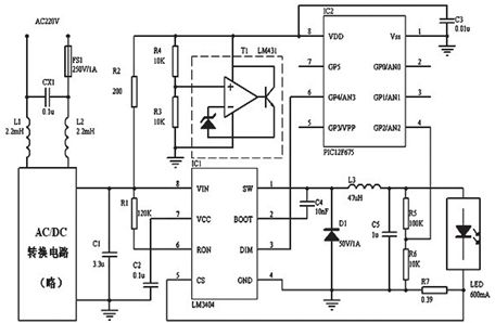 LM3404的輸出經R5、R6分壓后輸入PIC12F675的模擬端口AN2,PIC12F675經內部AD轉換、計算獲取LED光源的正向電壓,根據設定值程序產生PWM信號,通過GP4引腳接入LM3404的DIM端對其輸出功率進行調整。