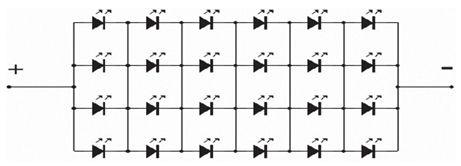 在實際應用中,往往不需要確定LED結溫的特別精確的數值,此時可以用試驗的方法確定整體燈具LED光源結溫的估算數值。以一個12W筒燈為例,光源部分由4并6串中功率LED組成,其電路連接形式如下:
