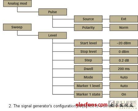測(cè)試臺(tái)(圖1)使用一個(gè)與SMIQ RF信號(hào)發(fā)生器“脈沖”輸入相連接的脈沖發(fā)生器。為了在功率掃描模式中使用SMIQ,功率掃描必須與信號(hào)分析器中的時(shí)基掃描同步。幸好,當(dāng)與二極管檢測(cè)器和類似XY模式濾波鏡的顯示器相關(guān)聯(lián)時(shí),這一類信號(hào)發(fā)生器具有可以被用作純量網(wǎng)絡(luò)分析儀(SNA)的特性。在SMIQ的后部面板上,有幾個(gè)帶有功率掃描斜線以驅(qū)動(dòng)濾波鏡的X軸的BNC連接器,以及校準(zhǔn)顯示器X軸的標(biāo)記。既然這樣,“標(biāo)記”的輸出被當(dāng)作信號(hào)分析器的觸發(fā)信號(hào)來(lái)使用。