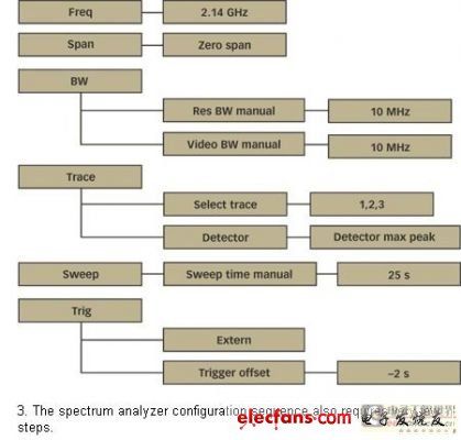 正如已經(jīng)提到的一樣,頻譜分析器在“零檔”模式下使用。不論是分辨率帶寬還是視頻帶寬,均設(shè)為10MHz,因?yàn)轭l譜分析器被用來(lái)測(cè)量峰值功率。基于同樣的理由,檢測(cè)器必須在“最大峰值”模式下設(shè)置。選取25s的掃描時(shí)間以便獲得對(duì)屏幕的整體掃描。選擇外部觸發(fā)器的可選項(xiàng)。利用“觸發(fā)器偏差”特性將屏幕上的軌跡置于中心也是一種明智的選擇。-2s即是合適的。圖3顯示了詳細(xì)的配置序列。