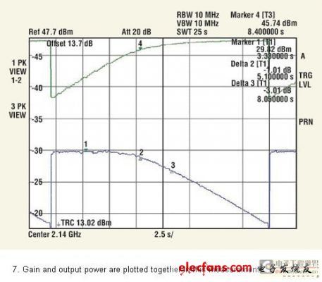 用于頻譜分析器的功能序列顯示在圖4中。此刻,頻譜分析器連接到輸入,且輸入功率在第二條線跡(線跡2)獲取,并保持在“觀察”模式。圖5中的黑色線跡即得。當(dāng)在輸出再連接分析器之后,從第三條線跡(線跡3)獲得輸出功率,同樣也保持在“觀察”模式。通過(guò)設(shè)置“輸出偏差”值的參數(shù)等級(jí)偏差,該值在校準(zhǔn)階段被設(shè)為43.7dB,從“線跡3”可以直接讀取以dBm為單位的絕對(duì)輸出功率,圖5中的綠線即得。通過(guò)在鋸齒末端的平面區(qū)域安置標(biāo)記,可以讀取如圖5 中綠線所示的飽和功率。MW4IC2230MB顯示+47.23dBm的飽和功率。