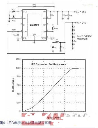 圖4顯示了測得的LED電流與IADJ引腳和Gnd之間的電位器電阻的關系圖。1Amp處的平頂表示最大額定LED電流,該值由圖4中所示的電流檢測電阻 RSNS設置。