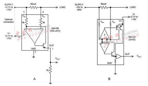 電流分路.是專門用于分路電流檢測(cè)的高共模電壓差動(dòng)放大器,能夠解決電阻型差動(dòng)放大器的局限性。電流分路.與差動(dòng)放大器相比的主要區(qū)別在于:其共模電壓功能通常只擴(kuò)展到正電壓,而一些電流分路.允許共模接地。這會(huì)造成更多的衍生情況,我們隨后還要談到。共模電壓功能也允許擴(kuò)展到負(fù)電壓。電流分路.從一開(kāi)始設(shè)計(jì)時(shí)就是以單電源電壓工作的,通常最低電壓可達(dá) 2.7V。圖 3 顯示了兩類電流分路.,分為電流輸出型分路.和電壓輸出型分路.。電流輸出型分路.通常靜態(tài)電流較低,需要外部輸出電阻,從而使終端用戶能夠設(shè)定增益。電壓輸出器件采用固定增益且不需要其他組件。
