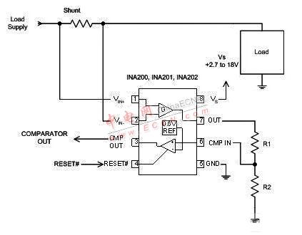 在許多應(yīng)用中,電流應(yīng)與某個(gè)設(shè)定值相比較。通常說(shuō)來(lái),進(jìn)行電流比較還需要電流分路.、比較器和參考電壓。此外,理想的比較器輸出應(yīng)與大多數(shù)常見(jiàn)的邏輯電路很好地兼容。圖 5 給出了電流比較的例子。在本例中,將電流與采用 TI INA200 系列電流分路.和比較器的簡(jiǎn)單單電壓結(jié)點(diǎn)進(jìn)行了比較。R1 和 R2 形成分壓器,以根據(jù) INA200 系列比較器的內(nèi)置 0.6V 電壓結(jié)點(diǎn)來(lái)設(shè)置電壓結(jié)點(diǎn)。(INA200 系列的增益很有特點(diǎn):INA200 的增益為 20,INA201 的增益為 50,INA202的增益為 100。)