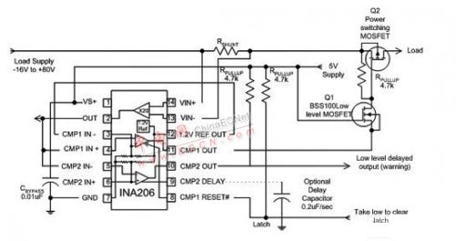 圖 6 顯示了電流與兩個(gè)電壓結(jié)點(diǎn)比較的電路。較低的電壓結(jié)點(diǎn)激活警報(bào)輸出,我們可為其配置一個(gè)適當(dāng)?shù)难舆t電路,以避免錯(cuò)誤的瞬態(tài)觸發(fā)。較低的電壓結(jié)點(diǎn)在比較器輸入端內(nèi)置閾值為 0.6V。Q1 為較高電壓結(jié)點(diǎn)輸出提供緩沖,通過(guò)電源開(kāi)關(guān) MOSFET 關(guān)閉電源,如果電流超過(guò)上限則啟用 Q2。較高電壓結(jié)點(diǎn)采用 INA206 的 1.2V 參考電壓,INA206 具有避免在沒(méi)有鎖存功能的電壓結(jié)點(diǎn)發(fā)生振蕩的鎖存功能。