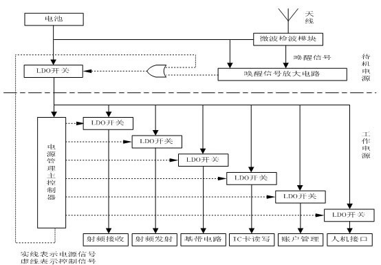 激活的MCU,使用中斷編寫方式,對各個I/O 進行判斷后分時控制,輸出各個耗電模塊的DC/DC使能高電平信號,分時為射頻接收、射頻發送、基帶電路、IC卡讀寫、賬戶管理及人機接口供電;在任一時刻,系統除主控制器外最多只為2 個模塊供電,大大減少了系統的功耗。