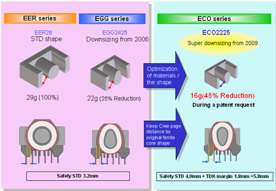 活用高性能材質的優點,以EER28市面上最常用的一種變壓器型號分析。由于密度更大,我們可以使變壓器更輕、更小。比如在同樣功率的情況下,用高性能材質體積和重量會比普通材質更小。這邊僅以EER28為例,我們將以ECO2225系列可以取代市場上的EER28,重量有45%的消減。