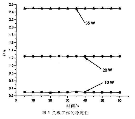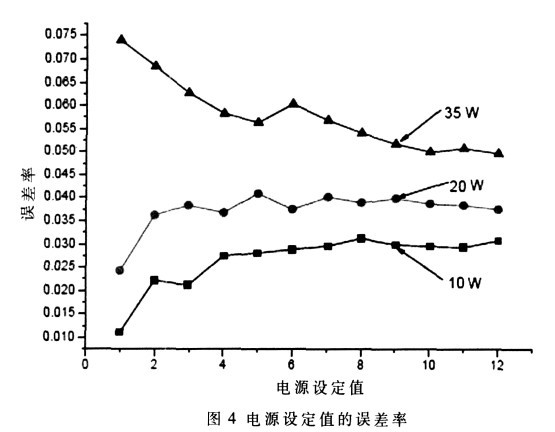 由于輸出電流達到8 A, 對電源的功率要求較高, 易產(chǎn)生噪聲, 這種隨機噪聲也會對輸出電流產(chǎn)生一定的影響。為減弱這種噪聲, 各個模塊分別供電, 以減少交叉干擾, 同時在電路板上多加裝去耦濾波電容, 減小干擾的影響, 同時OPA549 能有效地抑制紋波。影響電源穩(wěn)定性的因素很多, 如負載的變化、取樣電阻的變化、A/D、D/A 的影響等。如圖4 所示, 不同負載的情況下, 電源誤差不同。10 W 的負載, 由于功率較低, 在電壓、電流增加時, 誤差變化也較小。35 W 的負載, 由于功率較大, 工作電流的變化范圍比較大, 功耗較大, 電源的誤差變化相應地也比較大。如圖5, 在10 W、20 W 和35 W 的負載時, 工作狀態(tài)穩(wěn)定, 能夠滿足大電流、大功率的需要。