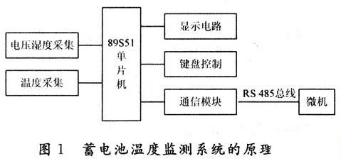 蓄電池溫度監測系統的原理框圖如圖1所示。主要由電壓、溫濕度采集、溫度采集、89S51單片機、鍵盤控制模塊、顯示電路模塊、通信模塊組成。該系統能完成6組或6組以上通信電池的溫度測量、1路機房環境測量(溫度、濕度測量)、2路直流電壓和2路交流電壓測量,傳輸數據距離大于200m。