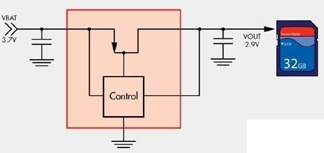 對于低速工作的小容量SD卡,耗電量常常小于100mA。假設鋰離子電池的額定工作電壓為3.7V,且存儲器的電源軌相當高,則線性調(diào)節(jié)器就成為SD存儲器的電源選擇。不過,選定的線性調(diào)節(jié)器必須能以低壓降(LDO)方式工作,因為鋰離子電池的有效電壓范圍在3.2至4.2V之間。