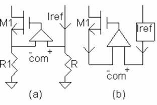 傳統的開關電源控制電路中, 電流極限比較器結構如圖1(a)所示, 檢測電流由M1( sense MOSFET)流入由多個開關管和電阻組成的網絡R1 中,該網絡通過控制開關管導通或關斷, 改變R1 的電阻值,得到不同的占空比。另外一基準電流流過一阻值固定的電阻R, 產生一固定參考電壓。當R1 的壓降隨檢測電流上升到參考電壓時,比較器關斷功率管, 保證輸出電壓穩定。其工作原理如圖2(a) 所示,例如: R1 上的電壓從a 上升到d, 從而關斷功率管產生一占空比, 當改變R1 的電阻值, R1 上的電壓從a 上升到f 得到另一占空比。從圖1(a)可以看出:傳統的開關電源電流極限比較器是將兩種電流先轉化成電壓再進行比較,需要占芯片面積非常大的電阻網絡和開關管, 并且為保證電阻精度, 一般需要激光修調技術,這大大增加了芯片成本。因此本文在此基礎上提出一種新型的電流極限比較器結構。