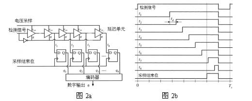 [page]控制處理器由高速A/D轉(zhuǎn)換器,數(shù)字PID補償器和數(shù)字DPWM輸出組成。外部存儲器記錄了控制處理器的相關(guān)程序。高速A/D轉(zhuǎn)換器是基于CMOS的傳輸延遲時間td 影響輸入電壓VDD的原理做成的,VDD電壓和傳輸時間是成近似的反比例關(guān)系,即VDD越大,信號傳輸延遲時間越小。如圖2所示,以CMOS的輸入電壓VDD作位采樣電壓的輸入口,各信號之間的傳輸時間延時td受采樣電壓VDD影響。第四分之三個采樣周期過后采樣結(jié)束位產(chǎn)生高電平,開始記錄q1到q8的輸出,把得到的結(jié)果送入編碼器得到數(shù)字輸出e,完成A/D轉(zhuǎn)換。如圖2b所示,數(shù)字采樣值為11111100.VDD越大,td越小得到的采樣值越大。