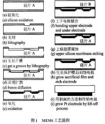 硅電容式壓力傳感器的敏感元件是半導體薄膜,它可以由單晶硅、多晶硅等利用半導體工藝制作而成。典型的電容式傳感器由上下電極、絕緣體和襯底構成。當薄膜受壓力作用時,薄膜會發生一定的變形,因此,上下電極之間的距離發生一定的變化,從而使電容發生變化。但電容式壓力傳感器的電容與上下電極之間的距離的關系是非線性關系,因此,要用具有補償功能的測量電路對輸出電容進行非線性補償。由于高溫壓力傳感器工作在高溫環境下,補償電路會受到環境溫度的影響,從而產生較大的誤差。基于模型識別的高溫壓力傳感器,正是為了避免補償電路在高溫環境下工作產生較大誤差而設計的,其設計方案是把傳感器件與放大電路分離,通過模型識別來得到所測環境的壓力。高溫工作區溫度可達350℃。傳感器件由鉑電阻和電容式壓力傳感器構成。其MEMS工藝如下: