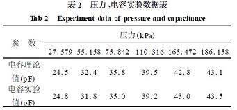 1可見,擬合的電容誤差小于1%。由此可見,在不同的時刻測得UO(t),通過曲線擬合得出參數RC。再給電路加小信號直流電源,測出R值,即求得C,通過C值則可知被測環境的壓力。圖5為350℃時,不同的壓力所對應的電容的理論值和實驗值,從實驗數據(表2)可得,在測壓的過程中,利用模型識別的方法,誤差較小,其測壓誤差小于2%。