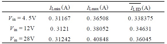 分別在V in = 2. 5V , V in = 28V 的情況下,再次對L ED 驅動電流進行仿真,三次仿真數據結果分別如表1 所示。