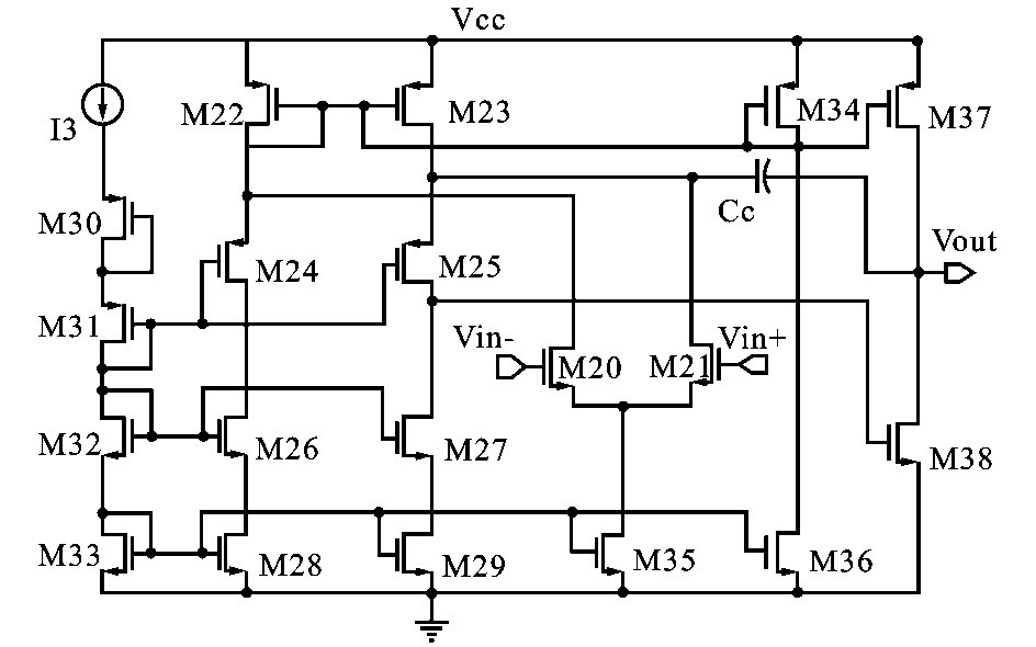 以上分析可知運算放大器起著重要作用,其必須具有較高的增益,才能使A 點電壓精確跟隨參考電壓,從而準確設定B 點電平和滯環電壓大小。 另外由于V out的變化頻率與系統開關頻率相同(系統的最大開關頻率約為2MHz) ,使得流過M1 的電流也相同頻率在IM1和I′M1之間快速切換,所以運放的單位增益帶寬須大于系統的最大開關頻率。 設計的運放結構如圖4 所示,采用折疊式輸入結構,可以獲得較大的共模輸入電壓范圍。
