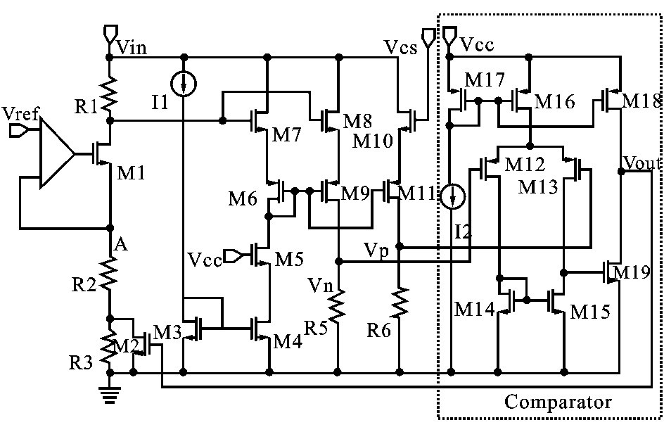 4. 5V~28V 的輸入電壓經調整轉換為5V 的恒定電壓Vcc 為后續電路供電。 如圖3 所示,A 點電位受運算放大器鉗制,將等于參考電壓1. 2V ,假設輸出V out 為高電平,則M2 導通,流過M1 的電流為IM1 = V ref / R2 ,B 點的電壓為V BL = V in - IM1 R1 ;當V out為低電平,M2 截止,流過M1 的電流變為I′M1= V ref / ( R2 + R3 ) ,B 點電壓升高為V BH = V in -I′M1 R1 ,所以B 點電壓的變化為ΔV B = V BH - V BL= V ref R1 R3/ R2 ( R2 + R3) ,這意味著V out由高電平變成低電平時在B 點產生的一個滯環電壓,可見該滯環電壓與輸入電壓無關,只由參考電壓V ref和電阻大小決定,通過選擇各電阻的阻值便可設定滯環電壓的大小。