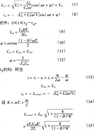 當輔助開關sa斷開后,由于磁飽和電感ls瞬間相當于開路,因此變壓器勵磁電流可完全用來對cds2和cds1充放電。[t4~t5]、[t5~t0′]期間,等效電路同圖4。顯然,令式(21)和(24)中io*或io為零,即可得到主開關管零電壓導通的能量條件和時間條件,im(max)≥cdsωvin,即:
